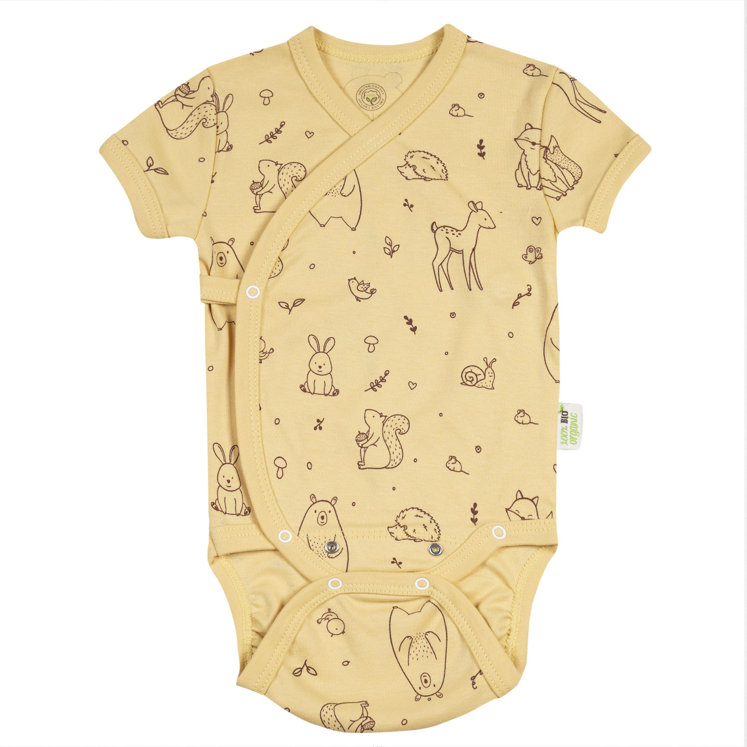 Baby body with short sleeves wrap style - soft yellow wiyh animal print