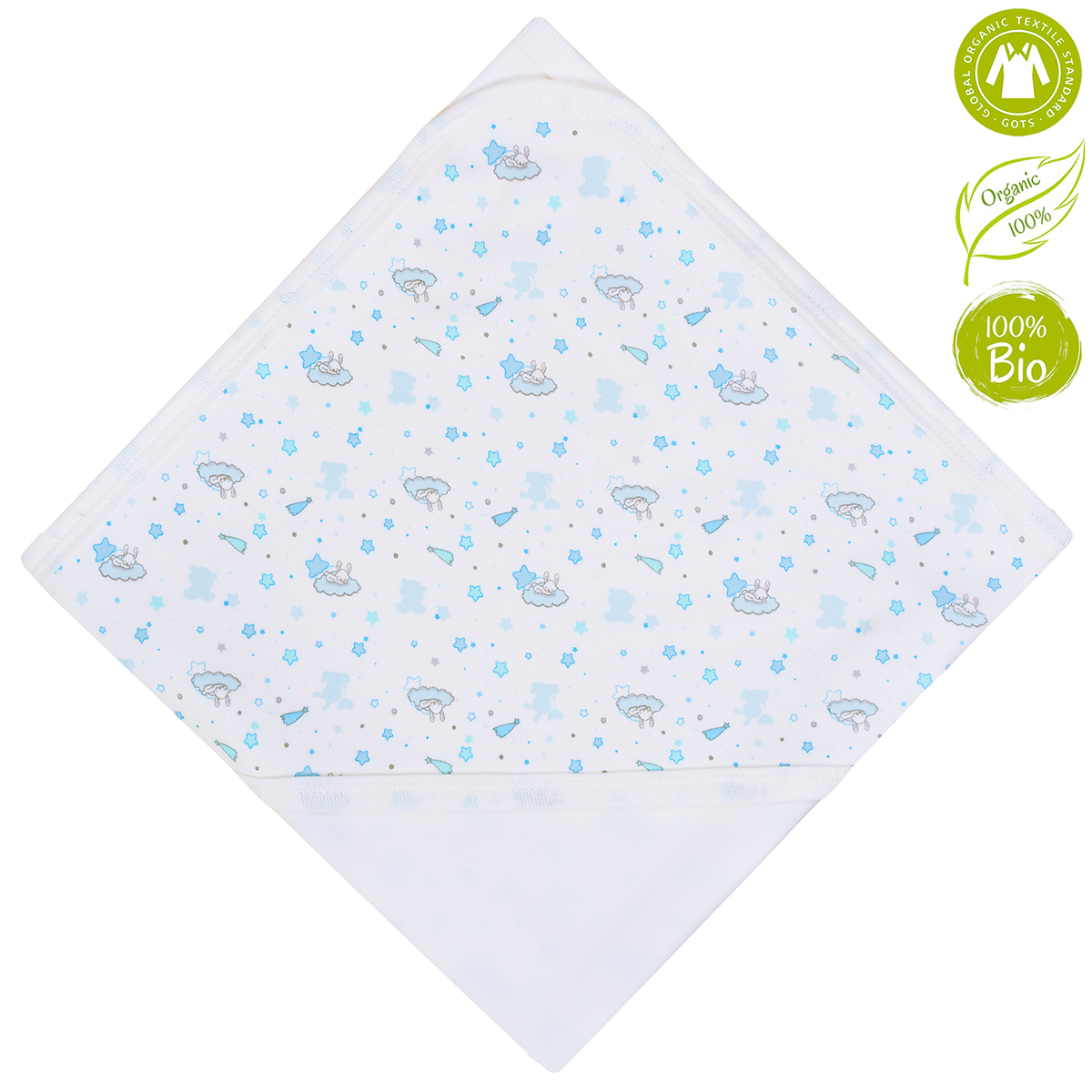 Double sided baby hooded blanket Bio Baby is suitable for boys and girls, made from the highest quality, hand-harvested organic cotton. The blanket is exceptionally soft and gentle for your baby's sensitive skin. Double face – on the one side organic cotton jersey fabric and lovely printed jersey on the other.