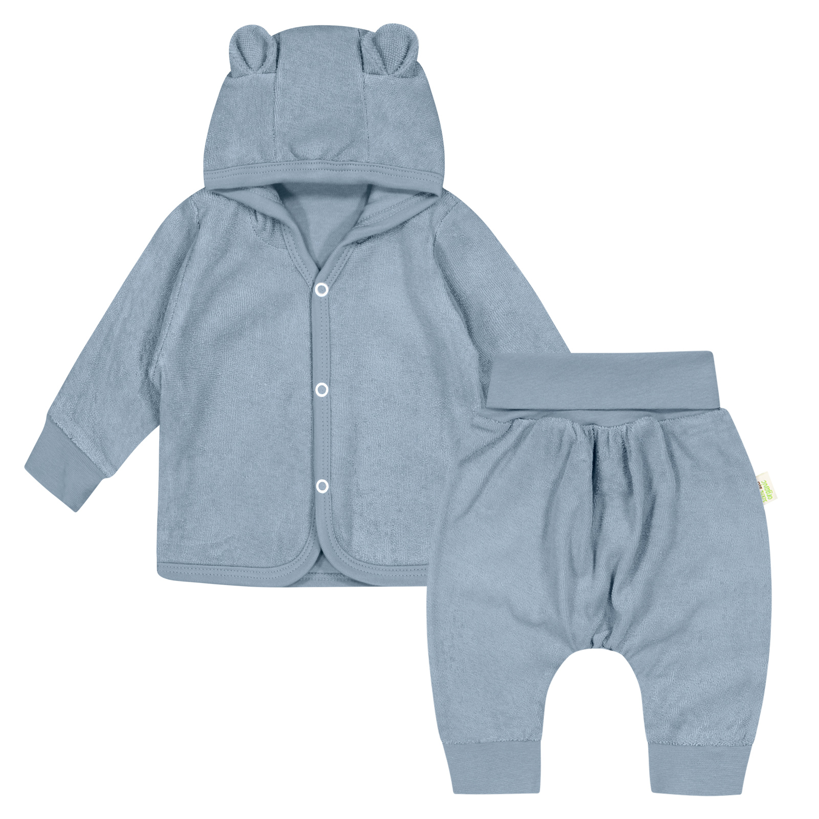 This adorable gift set from Bio Baby is a must-have for any eco-conscious parent. The set includes a hoodie jacket and harem pants in a soft pastel blue, both made from organic frotte cotton (GOTS certified). The harem pants have a relaxed fit, elastic waistband and cuffs for a secure fit, and a tapered ankle for plenty of room for movement. The hoodie jacket is lined with soft jersey fabric, has press studs for easy wear, and a hood for extra warmth. Keep your little one cozy and stylish with this comfortable and sustainable gift set.