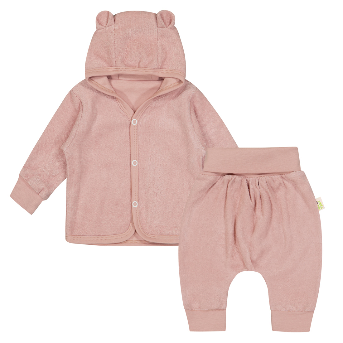 Keep your little one comfortable and stylish with this adorable gift set from Bio Baby. The set includes a hoodie jacket and harem pants in pastel pink, both made from 100% organic frotte cotton (GOTS certified). The harem pants have a relaxed fit, elastic waistband and cuffs for a secure fit, and a tapered ankle for plenty of room for movement. The hoodie jacket is lined with soft jersey fabric, has press studs for easy wear, and a hood for extra warmth. Perfect for everyday wear, this gift set is a must-have for any eco-conscious parent.